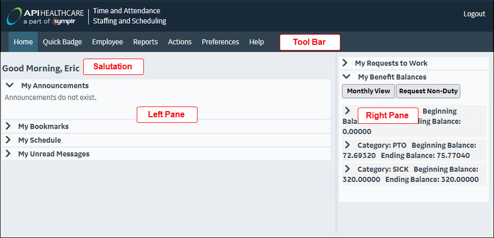 The salutation welcomes you to the application. The name displayed in the salutation can be changed in the Preferred Name field found in . |